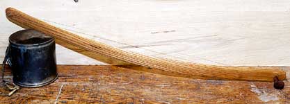 Traditional mountain instrument transferred from African-American to Anglo culture during the 19th century; great granddaddy of the jaw harp; uses your head to amplify the sound of the plucked string--really! Sassafras with a cherry tuning peg.